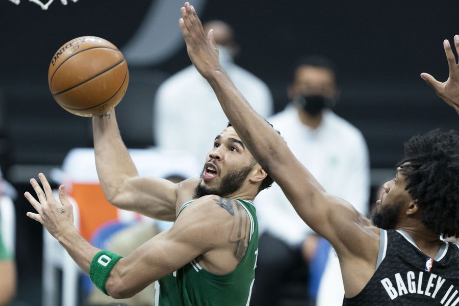 February 3, 2021; Sacramento, California, USA; Boston Celtics forward Jayson Tatum (0) shoots the basketball against Sacramento Kings forward Marvin Bagley III (35) during the third quarter at Golden 1 Center. Mandatory Credit: Kyle Terada-USA TODAY Sports