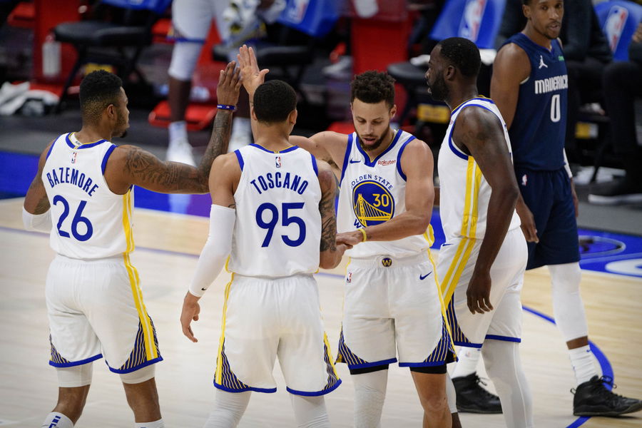 Feb 6, 2021; Dallas, Texas, USA; Golden State Warriors forward Kent Bazemore (26) and forward Juan Toscano-Anderson (95) and guard Stephen Curry (30) and forward Draymond Green (23) during the game between the Dallas Mavericks and the Golden State Warriors at the American Airlines Center. Mandatory Credit: Jerome Miron-USA TODAY Sports