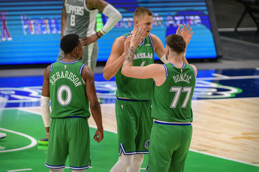 Mar 17, 2021; Dallas, Texas, USA; Dallas Mavericks guard Josh Richardson (0) and center Kristaps Porzingis (6) and guard Luka Doncic (77) celebrate during the third quarter against the LA Clippers at the American Airlines Center. Mandatory Credit: Jerome Miron-USA TODAY Sports