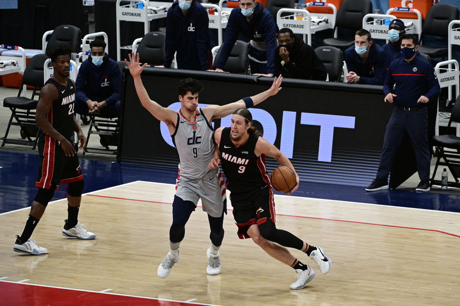 Jan 9, 2021; Washington, District of Columbia, USA; Miami Heat forward Kelly Olynyk (9) makes a move to the basket as Washington Wizards forward Deni Avdija (9) defends during the second half at Capital One Arena. Mandatory Credit: Tommy Gilligan-USA TODAY Sports