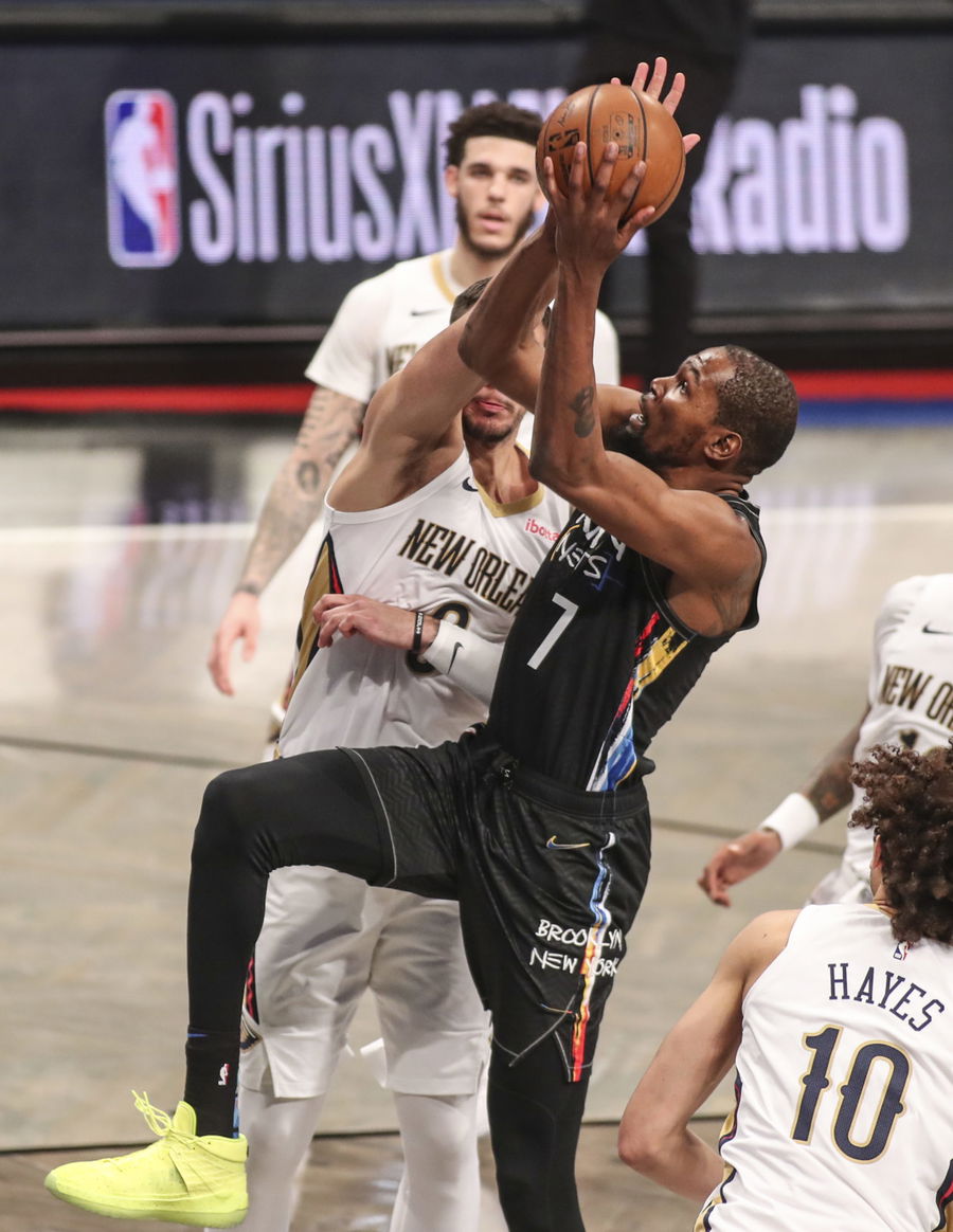 Apr 7, 2021; Brooklyn, New York, USA; Brooklyn Nets forward Kevin Durant (7) drives to the basket in the second quarter against the New Orleans Pelicans at Barclays Center. Mandatory Credit: Wendell Cruz-USA TODAY Sports