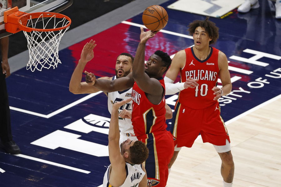 Jan 21, 2021; Salt Lake City, Utah, USA; New Orleans Pelicans forward Zion Williamson (1) shoots against Utah Jazz forward Georges Niang (31) and center Rudy Gobert (27) in the fourth quarter at Vivint Smart Home Arena. Mandatory Credit: Jeffrey Swinger-USA TODAY Sports