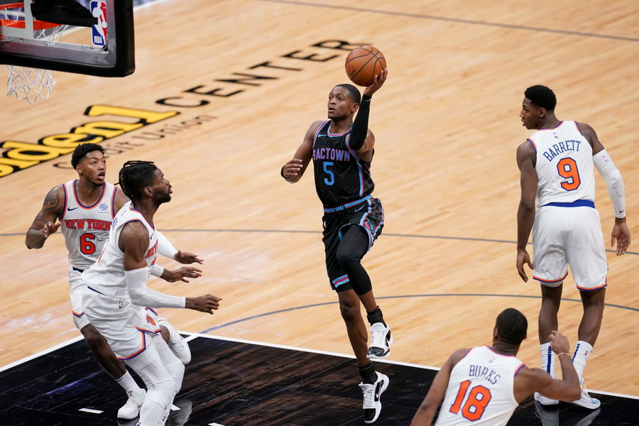 Jan 22, 2021; Sacramento, California, USA; Sacramento Kings guard De’Aaron Fox (5) shoots the ball against the New York Knicks in the third quarter at the Golden 1 Center. Mandatory Credit: Cary Edmondson-USA TODAY Sports