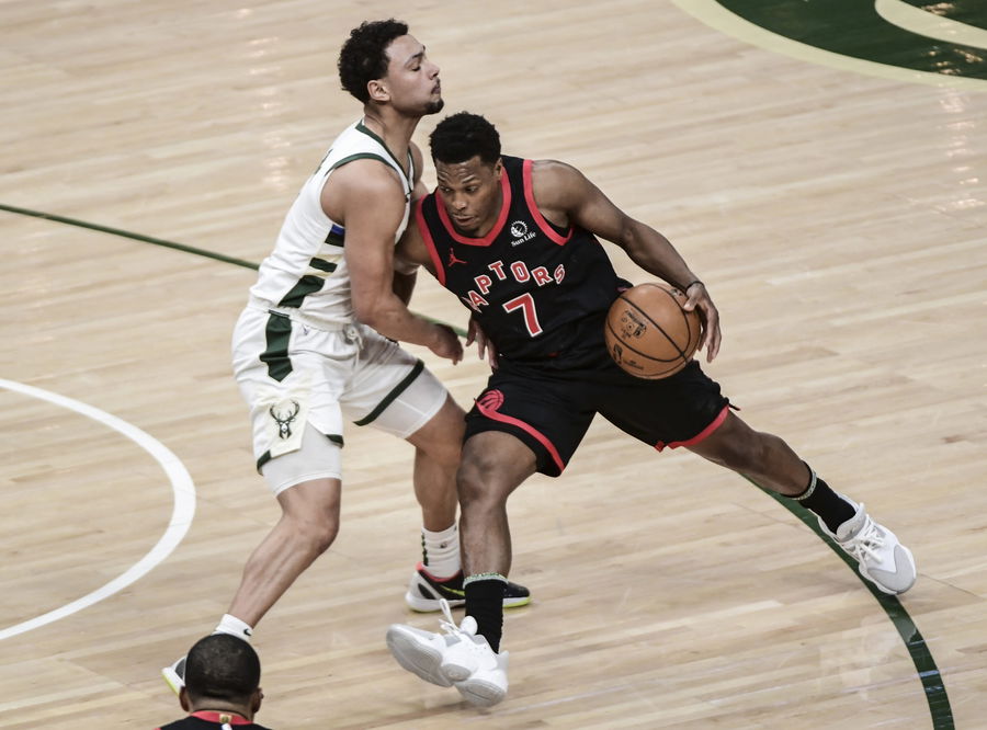 Feb 16, 2021; Milwaukee, Wisconsin, USA; Toronto Raptors guard Kyle Lowry (7) drives to the basket against Milwaukee Bucks guard Bryn Forbes (left) in the first quarter at Fiserv Forum. Mandatory Credit: Benny Sieu-USA TODAY Sports