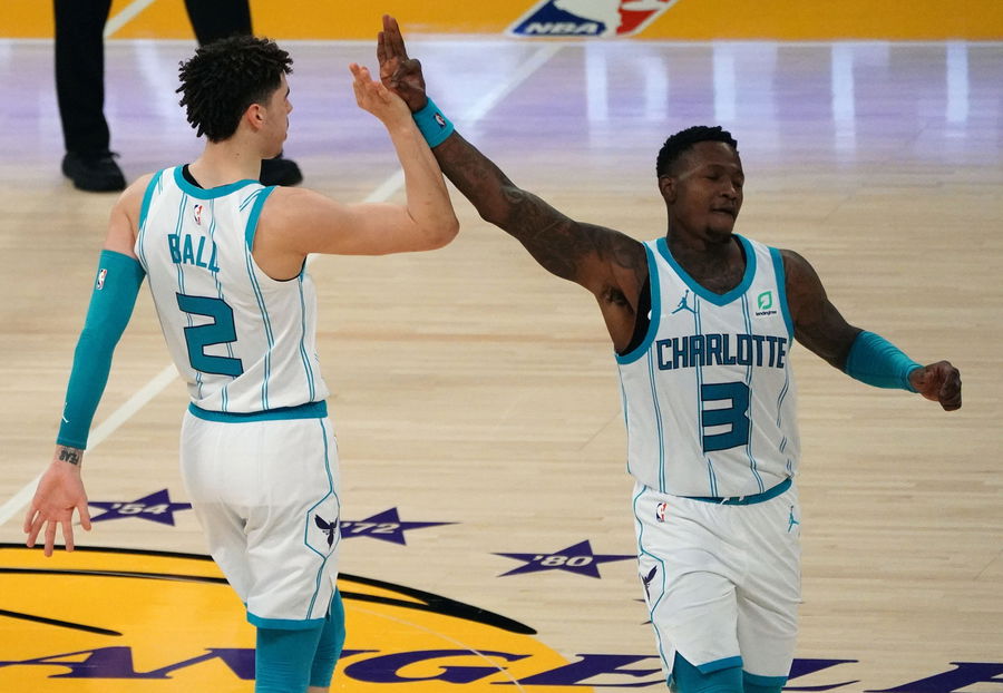 Mar 18, 2021; Los Angeles, California, USA; Charlotte Hornets guard LaMelo Ball (2) celebrates his basket scored with guard Terry Rozier (3) against the Los Angeles Lakers during the second half at Staples Center. Mandatory Credit: Gary A. Vasquez-USA TODAY Sports