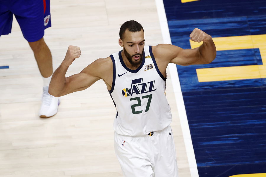 Jan 1, 2021; Salt Lake City, Utah, USA; Utah Jazz center Rudy Gobert (27) reacts after a basket against the LA Clippers in the fourth quarter at Vivint Smart Home Arena. Mandatory Credit: Jeffrey Swinger-USA TODAY Sports