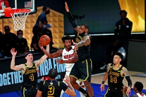 Oct 2, 2020; Orlando, Florida, USA; Los Angeles Lakers forward LeBron James (23) blocks the pass by Miami Heat forward Jimmy Butler (22) during the fourth quarter in game two of the 2020 NBA Finals at AdventHealth Arena. Mandatory Credit: Kim Klement-USA TODAY Sports