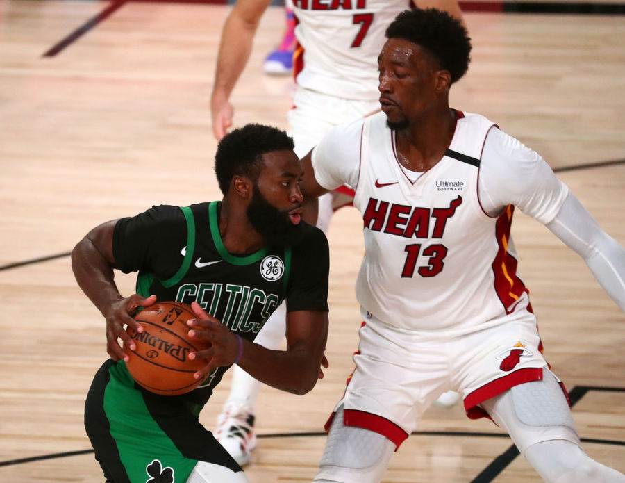 Sep 25, 2020; Lake Buena Vista, Florida, USA; Boston Celtics guard Jaylen Brown (7) moves the ball against Miami Heat forward Bam Adebayo (13) during the second half in game five of the Eastern Conference Finals of the 2020 NBA Playoffs at AdventHealth Arena. Mandatory Credit: Kim Klement-USA TODAY Sports