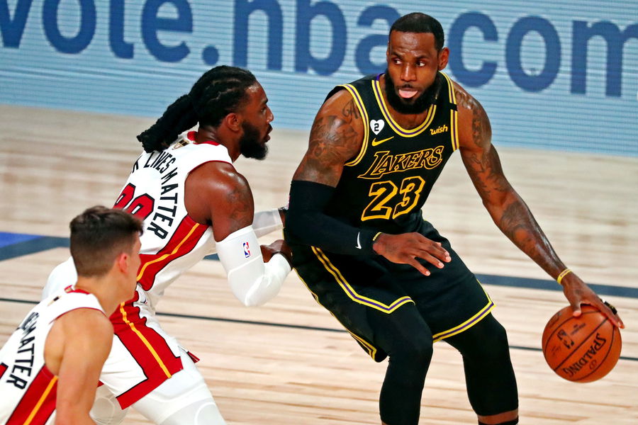 Los Angeles Lakers forward LeBron James handles the ball against Miami Heat forward Jae Crowder during the first quarter in game five of the 2020 NBA Finals. Mandatory Credit: Kim Klement-USA TODAY Sports