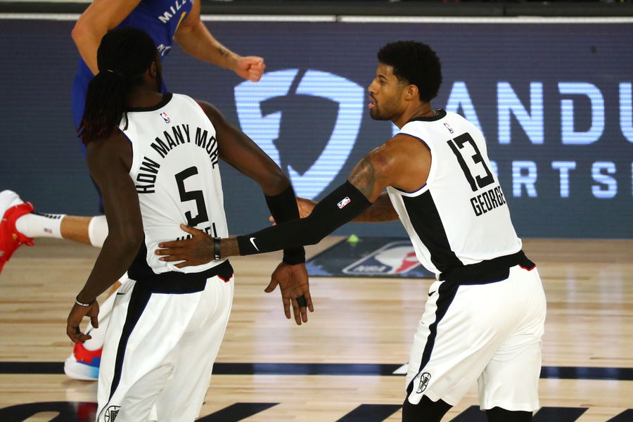 LA Clippers guard Paul George (13) celebrates with forward Montrezl Harrell (5) after making a three point basket against the Denver Nuggets during the first half of game five in the second round of the 2020 NBA Playoffs. Mandatory Credit: Kim Klement-USA TODAY Sports