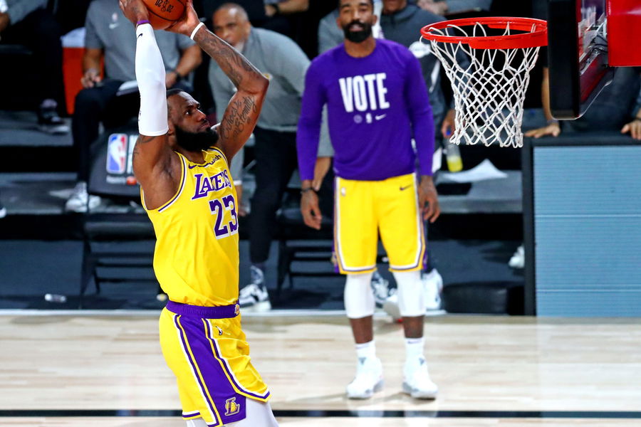 Los Angeles Lakers forward LeBron James dunks the ball during the first quarter against the Miami Heat in game 4 of the 2020 NBA Finals. Mandatory Credit: Kim Klement-USA TODAY Sports