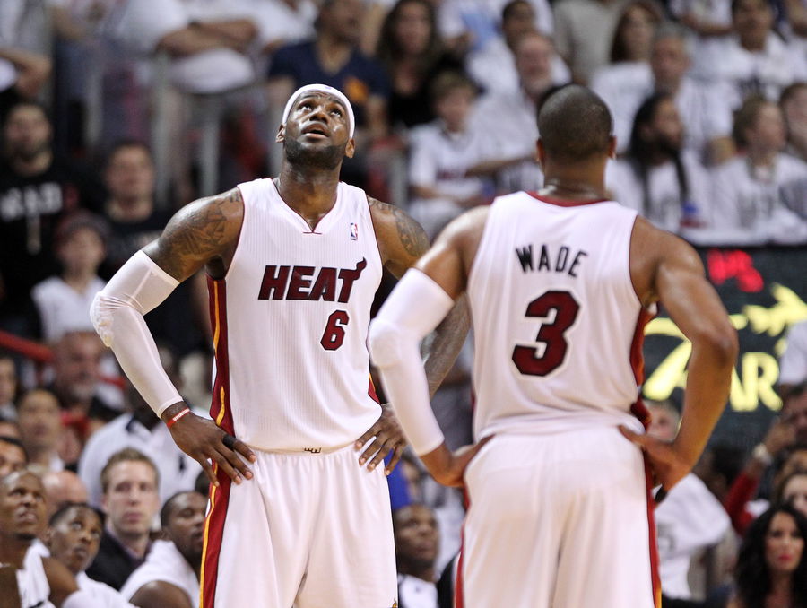 Miami Heat forward LeBron James (6) looks at a replay with Miami Heat guard Dwyane Wade (3) during the Eastern Conference NBA Finals at AmericanAirlines Arena in Miami on May 24, 2014. (Richard Graulich The Palm Beach Post)