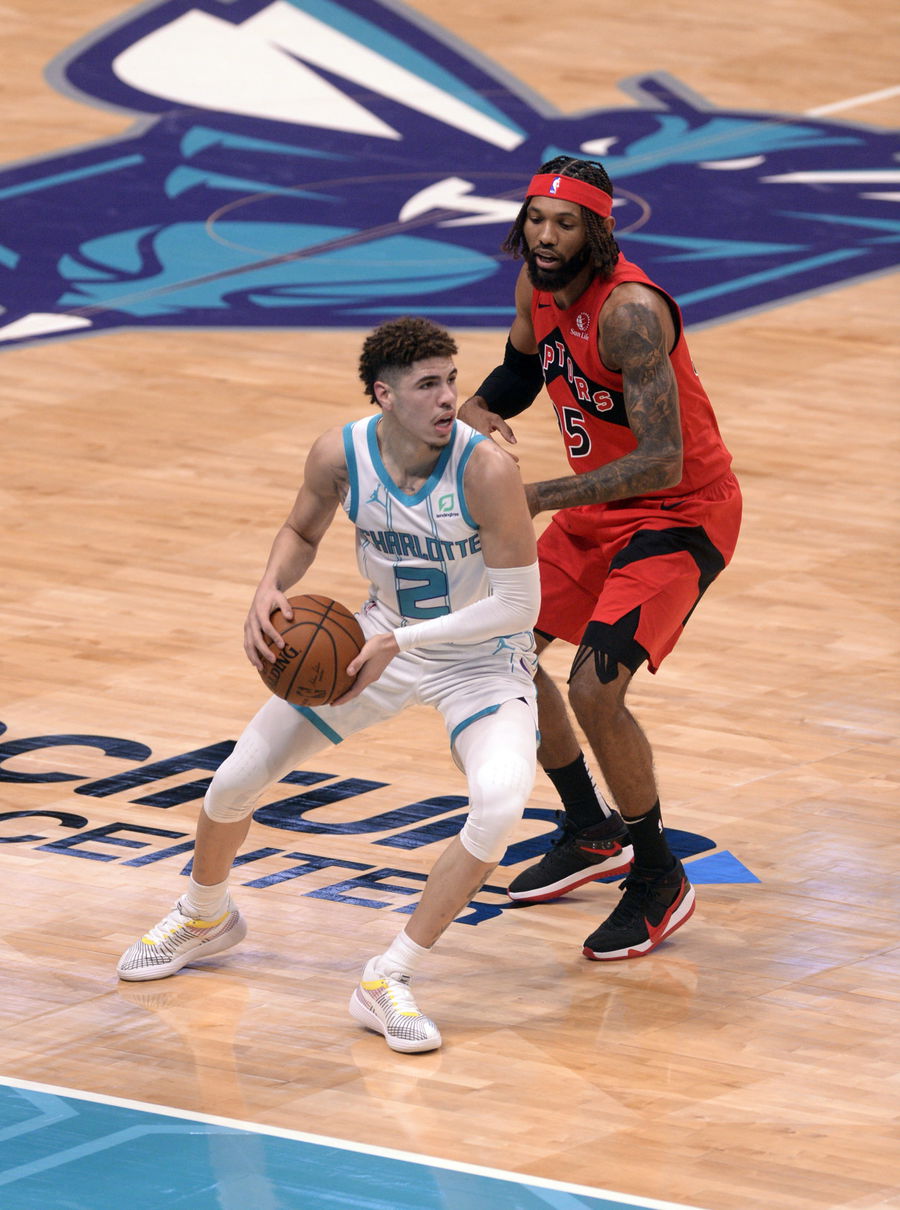 Dec 14, 2020; Charlotte, North Carolina, USA; Charlotte Hornets guard LaMelo Ball (2) drives past Toronto Raptors forward DeAndreÕ Bembry (95) during the second half at the Spectrum Center. Raptors won 112-109. Mandatory Credit: Sam Sharpe-USA TODAY Sports