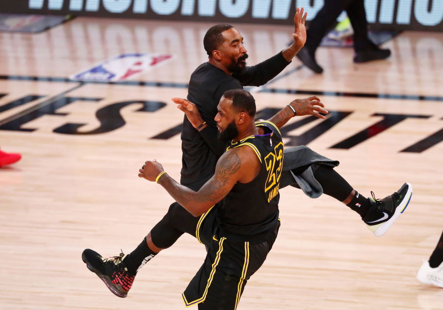 Los Angeles Lakers forward LeBron James is congratulated by guard JR Smith after dunking against the Houston Rockets during the second half of game two of the second round of the 2020 NBA Playoffs. Mandatory Credit: Kim Klement-USA TODAY Sports