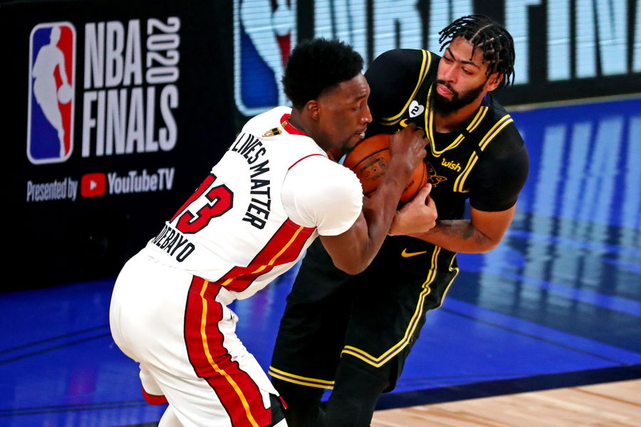 Oct 9, 2020; Lake Buena Vista, Florida, USA; Los Angeles Lakers forward Anthony Davis (3) and Miami Heat forward Bam Adebayo (13) go for the ball during the third quarter in game five of the 2020 NBA Finals at AdventHealth Arena. Mandatory Credit: Kim Klement-USA TODAY Sports