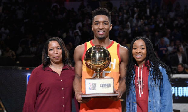 LOS ANGELES, CA – FEBRUARY 17: Donovan Mitchell #45 of the Utah Jazz (C) accepts the trophy for the 2018 Verizon Slam Dunk Contest at Staples Center on February 17, 2018 in Los Angeles, California. (Photo by Kevork Djansezian/Getty Images)