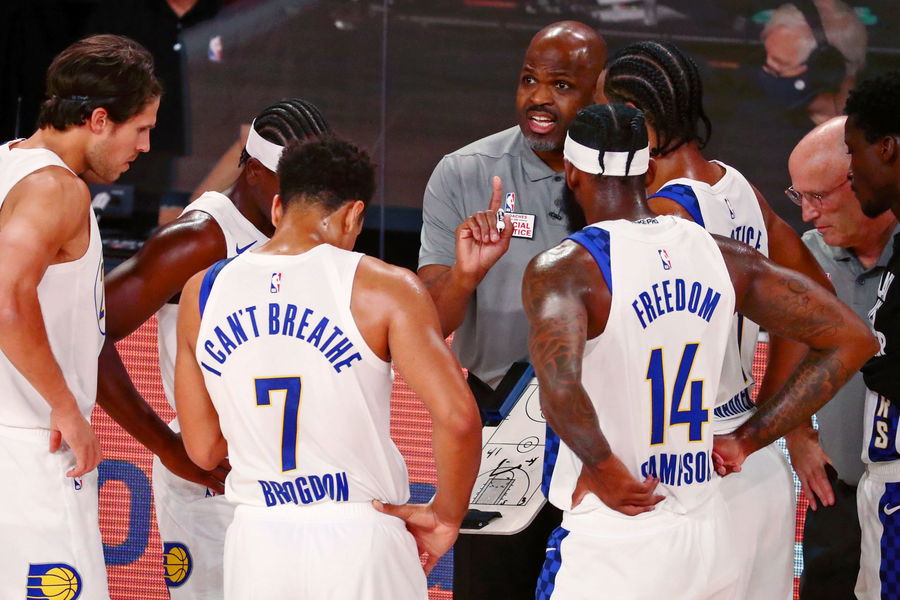 Aug 22, 2020; Lake Buena Vista, Florida, USA; Indiana Pacers head coach Nate McMillan talks with his team during a time out during the first half of Game 3 of an NBA basketball first-round playoff series against the Miami Heat at AdventHealth Arena. Mandatory Credit: Kim Klement-USA TODAY Sports