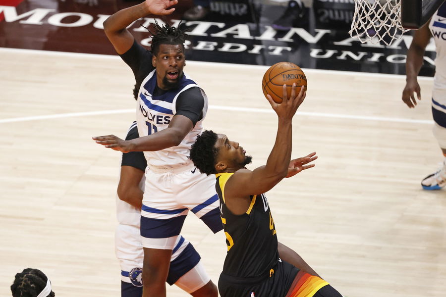 Dec 26, 2020; Salt Lake City, Utah, USA; Utah Jazz guard Donovan Mitchell (45) drives to the hoop past Minnesota Timberwolves guard R (11) in the fourth quarter at Vivint Smart Home Arena. Mandatory Credit: Jeffrey Swinger-USA TODAY Sports