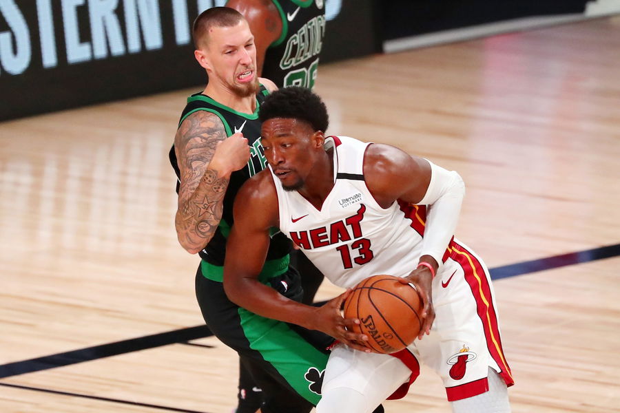 Miami Heat forward Bam Adebayo (13) drives to the basket as Boston Celtics center Daniel Theis (27) defends during the fourth quarter in game two of the Eastern Conference Finals of the 2020 NBA Playoffs at ESPN Wide World of Sports Complex. Mandatory Credit: Kim Klement-USA TODAY Sports