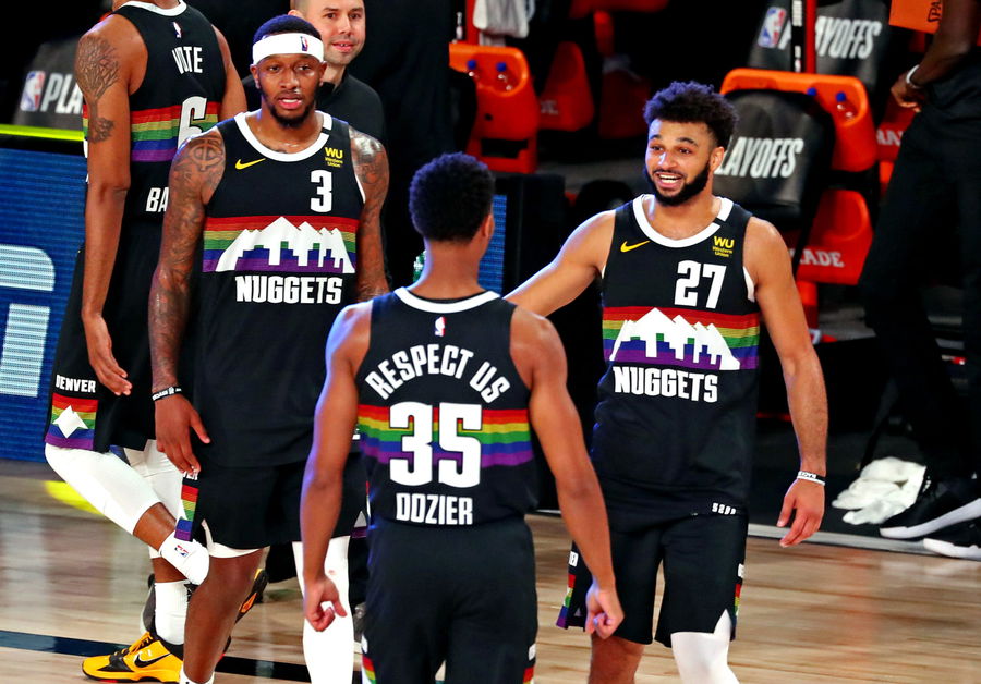 Denver Nuggets guard Jamal Murray (27) and guard PJ Dozier (35) celebrate after beating the LA Clippers in game six of the second round of the 2020 NBA Playoffs at ESPN Wide World of Sports Complex. Mandatory Credit: Kim Klement-USA TODAY Sports