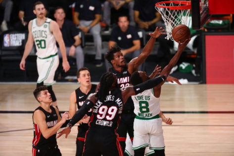 Sep 27, 2020; Lake Buena Vista, Florida, USA; Boston Celtics guard Kemba Walker (8) shoots defended by Miami Heat forward Jimmy Butler (22) and forward Jae Crowder (99) during second half in game six of the Eastern Conference Finals of the 2020 NBA Playoffs at AdventHealth Arena. Mandatory Credit: Kim Klement-USA TODAY Sports