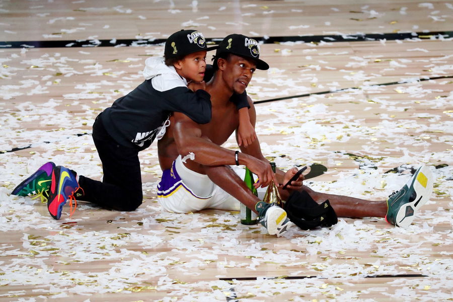 Los Angeles Lakers guard Rajon Rondo (9) sits on the court with his son after game six of the 2020 NBA Finals at AdventHealth Arena. The Los Angeles Lakers won 106-93 to win the series. Mandatory Credit: Kim Klement-USA TODAY Sports