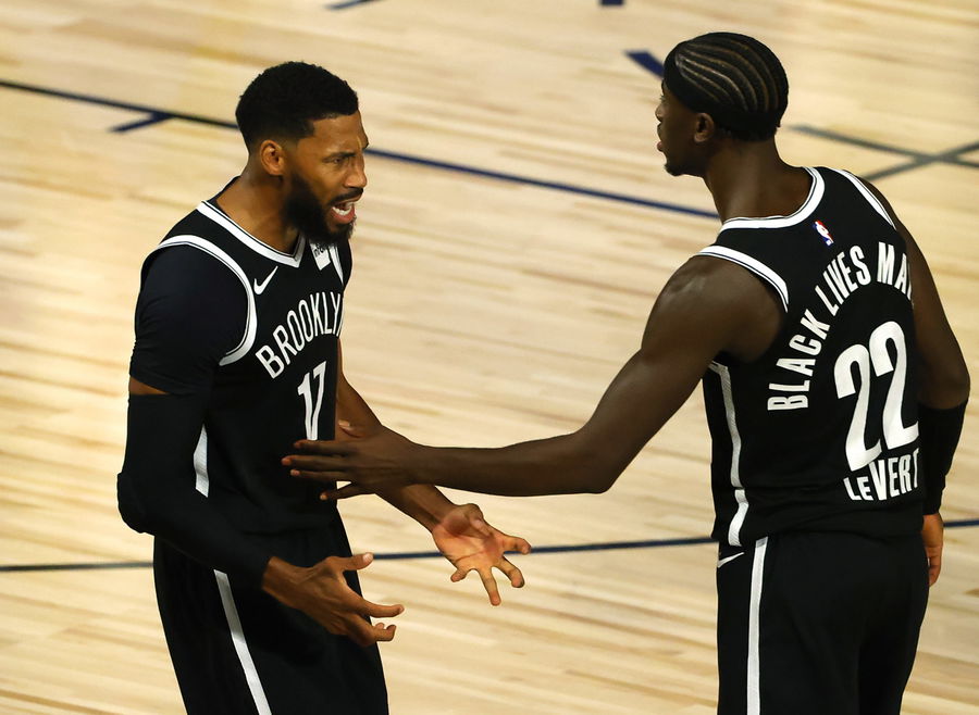 Brooklyn Nets guard Tyler Johnson reacts with guard Caris LeVert after making a three point basket against the Toronto Raptors during the first half in game four of the first round of the 2020 NBA Playoffs. Mandatory Credit: Kim Klement-USA TODAY Sports