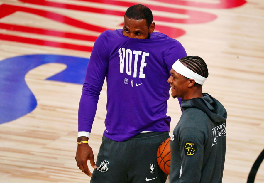 Oct 4, 2020; Orlando, Florida, USA; Los Angeles Lakers forward LeBron James (left) covers his nose and mouth with his shirt as he talks with guard Rajon Rondo (9) before game three of the 2020 NBA Finals against the Miami Heat at AdventHealth Arena. Mandatory Credit: Kim Klement-USA TODAY Sports