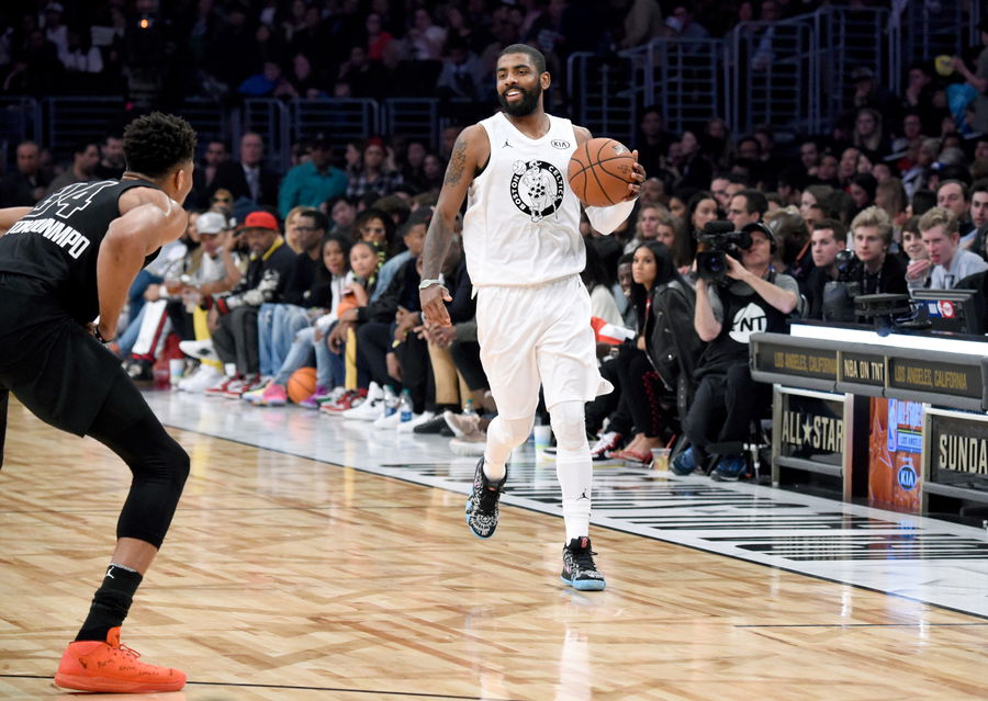 LOS ANGELES, CA – FEBRUARY 18: Giannis Antetokounmpo (L) and Kyrie Irving play during the 67th NBA All-Star Game: Team LeBron Vs. Team Stephen at Staples Center on February 18, 2018 in Los Angeles, California. (Photo by Kevin Mazur/WireImage)