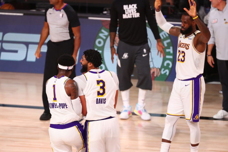 Los Angeles Lakers guard Kentavious Caldwell-Pope, forwards Anthony Davis and LeBron James celebrate after defeating the Houston Rockets in game three in the second round of the 2020 NBA Playoffs. Mandatory Credit: Kim Klement-USA TODAY Sports
