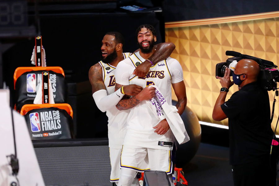Los Angeles Lakers forward LeBron James (23) and forward Anthony Davis (3) celebrate during the fourth quarter in game six of the 2020 NBA Finals at AdventHealth Arena. The Los Angeles Lakers won 106-93 to win the series. Mandatory Credit: Kim Klement-USA TODAY SportsMandatory Credit: Kim Klement-USA TODAY Sports
