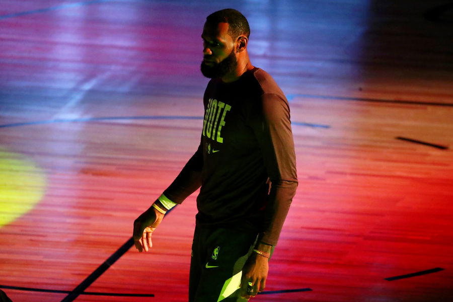 Los Angeles Lakers forward LeBron James during player introductions before game three of the 2020 NBA Finals against the Miami Heat. Mandatory Credit: Kim Klement-USA TODAY Sports