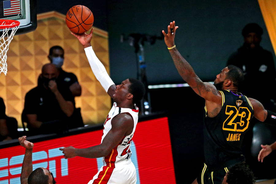 Oct 2, 2020; Orlando, Florida, USA; Miami Heat guard Kendrick Nunn (25) shoots the ball against Los Angeles Lakers forward LeBron James (23) during the fourth quarter in game two of the 2020 NBA Finals at AdventHealth Arena. Mandatory Credit: Kim Klement-USA TODAY Sports