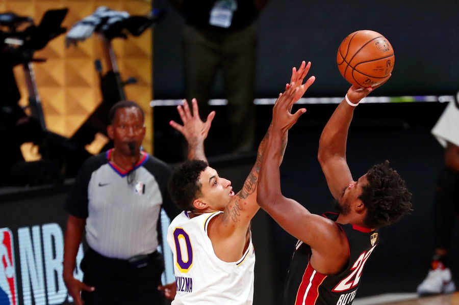 Miami Heat forward Jimmy Butler shoot against Los Angeles Lakers forward Kyle Kuzma during the second quarter in game six of the 2020 NBA Finals. Mandatory Credit: Kim Klement-USA TODAY Sports