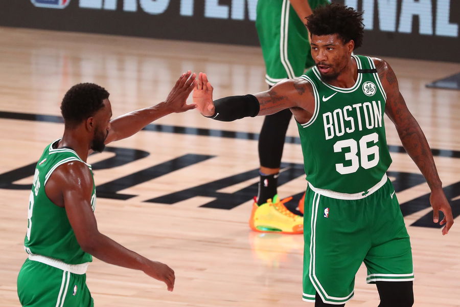 Sep 9, 2020; Lake Buena Vista, Florida, USA; Boston Celtics guard Marcus Smart (36) celebrates after a three pointer against the Toronto Raptors in the first half in game six of the second round of the 2020 NBA Playoffs at ESPN Wide World of Sports Complex. Mandatory Credit: Kim Klement-USA TODAY Sports