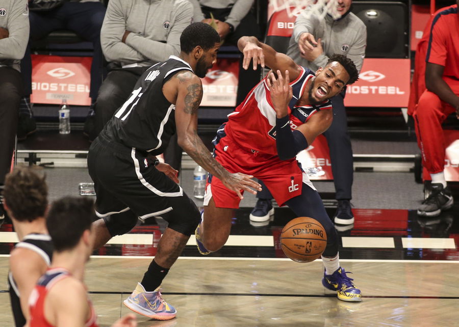 Dec 13, 2020; Brooklyn, New York, USA; Washington Wizards forward Rui Hachimura (8) reach after being fouled by Brooklyn Nets guard Kyrie Irving (11) in the first quarter at Barclays Center. Mandatory Credit: Wendell Cruz-USA TODAY Sports