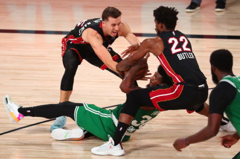 Sep 19, 2020; Lake Buena Vista, Florida, USA; Boston Celtics guard Marcus Smart (bottom) battles for a loose ball against Miami Heat guard Duncan Robinson (left) and forward Jimmy Butler (22) during the second half of game three of the Eastern Conference Finals of the 2020 NBA Playoffs at ESPN Wide World of Sports Complex. Mandatory Credit: Kim Klement-USA TODAY Sports