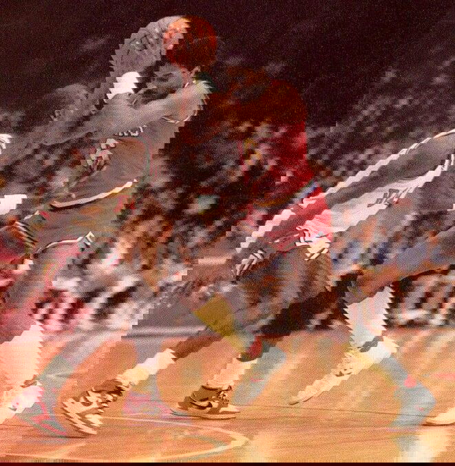 A young Michael Jordan is up against Julius Erving. A player whom many believe to be his inspiration