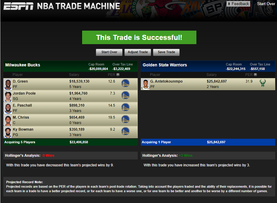 According to ESPN’s trade machine, this trade could help the Warriors add three more wins to their projected win total. However, the Bucks will only lose nine more games from their projected record.