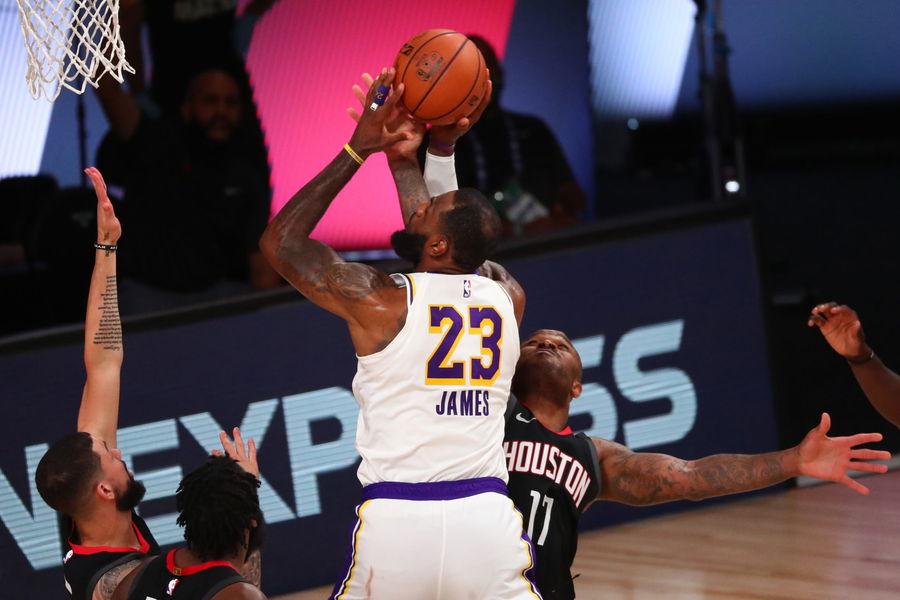 Sep 8, 2020; Lake Buena Vista, Florida, USA; Los Angeles Lakers forward LeBron James (23) prepares to shoot free throws against the Houston Rockets during the first half of game three in the second round of the 2020 NBA Playoffs at AdventHealth Arena. Mandatory Credit: Kim Klement-USA TODAY Sports