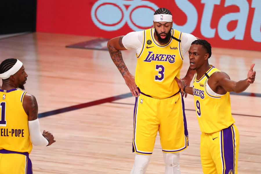 Sep 18, 2020; Lake Buena Vista, Florida, USA; Los Angeles Lakers guard Rajon Rondo (9) talks with forward Anthony Davis (center) and guard Kentavious Caldwell-Pope (left) during the second quarter in game one of the Western Conference Finals of the 2020 NBA Playoffs at AdventHealth Arena. Mandatory Credit: Kim Klement-USA TODAY Sports