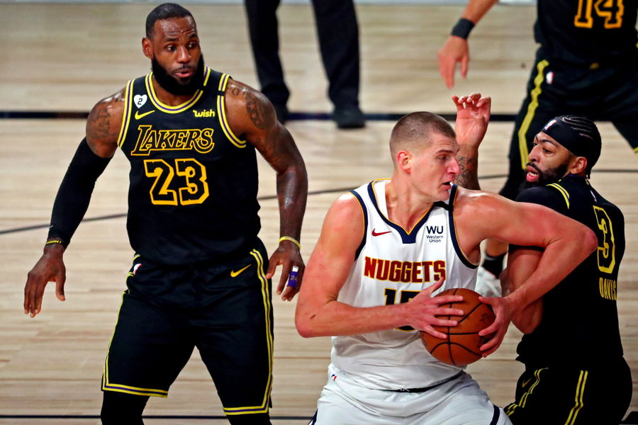 Denver Nuggets center Nikola Jokic (15) drives to the basket against Los Angeles Lakers forward Anthony Davis (3) and forward LeBron James (23) during the first quarter in game two of the Western Conference Finals of the 2020 NBA Playoffs at AdventHealth Arena. Mandatory Credit: Kim Klement-USA TODAY Sports