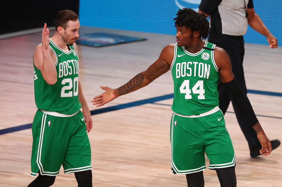 Sep 23, 2020; Lake Buena Vista, Florida, USA; Boston Celtics center Robert Williams III (44) celebrates with forward Gordon Hayward (20) after being fouled while shooting against the Miami Heat during the first half of game four of the Eastern Conference Finals of the 2020 NBA Playoffs at AdventHealth Arena. Mandatory Credit: Kim Klement-USA TODAY Sports