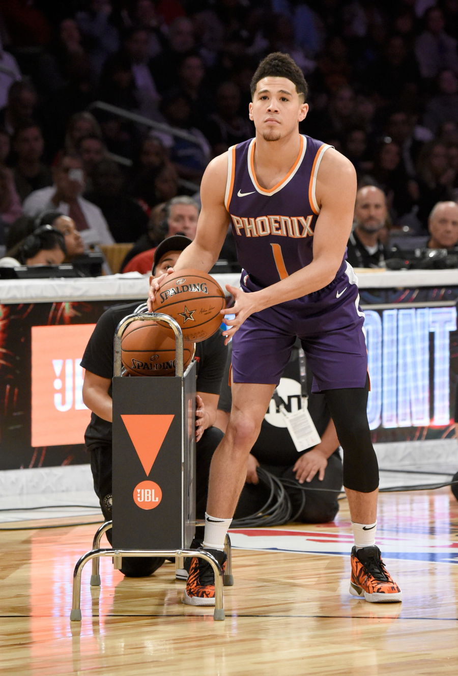 LOS ANGELES, CA – FEBRUARY 17: NBA player Devin Booker of the Phoenix Suns competes during the 2018 State Farm All-Star Saturday Night at Staples Center on February 17, 2018 in Los Angeles, California. (Photo by Kevin Mazur/WireImage)