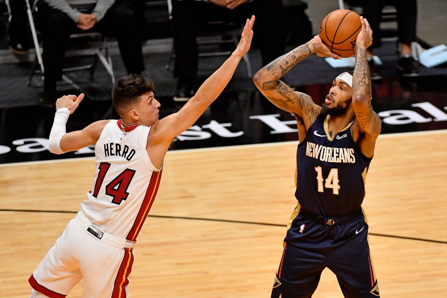 Dec 14, 2020; Miami, Florida, USA; New Orleans Pelicans forward Brandon Ingram (14) shoots the ball over Miami Heat guard Tyler Herro (14) during the first half at American Airlines Arena. Mandatory Credit: Jasen Vinlove-USA TODAY Sports