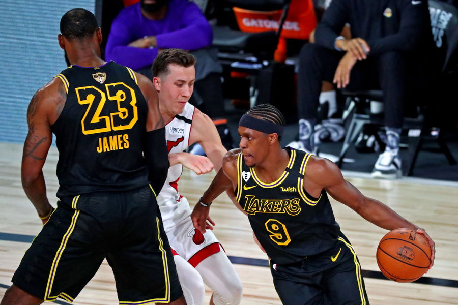 Los Angeles Lakers guard Rajon Rondo drives to the basket against Miami Heat guard Duncan Robinson during the second quarter in game two of the 2020 NBA Finals. Mandatory Credit: Kim Klement-USA TODAY Sports