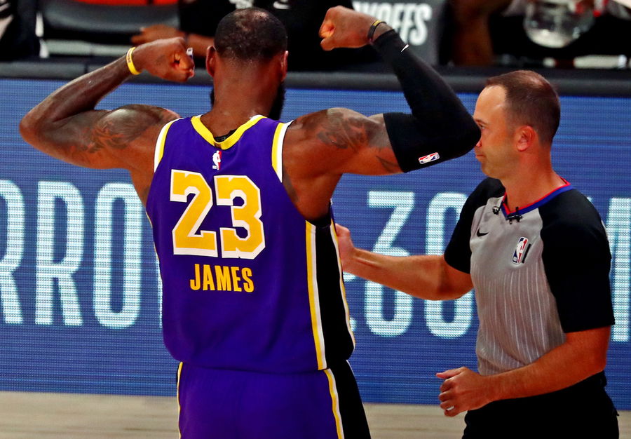 Los Angeles Lakers forward LeBron James reacts during the second half of game three of the Western Conference Finals of the 2020 NBA Playoffs against the Denver Nuggets. Mandatory Credit: Kim Klement-USA TODAY Sports