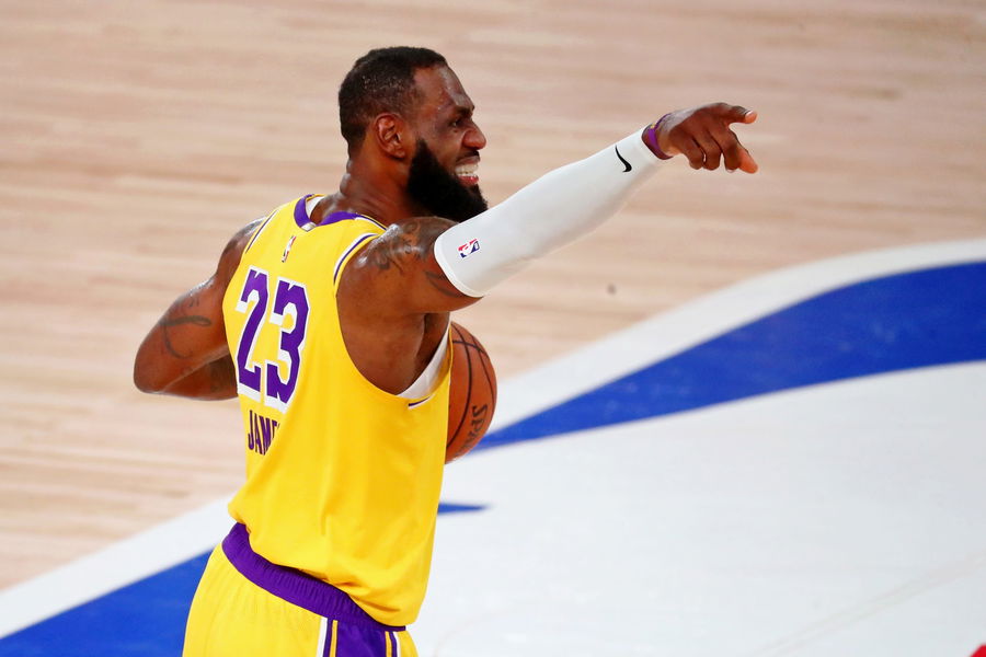 Los Angeles Lakers forward LeBron James (23) holds the ball as he gestures to his team during the third quarter in game one of the Western Conference Finals of the 2020 NBA Playoffs against the Denver Nuggets at AdventHealth Arena. Mandatory Credit: Kim Klement-USA TODAY Sports