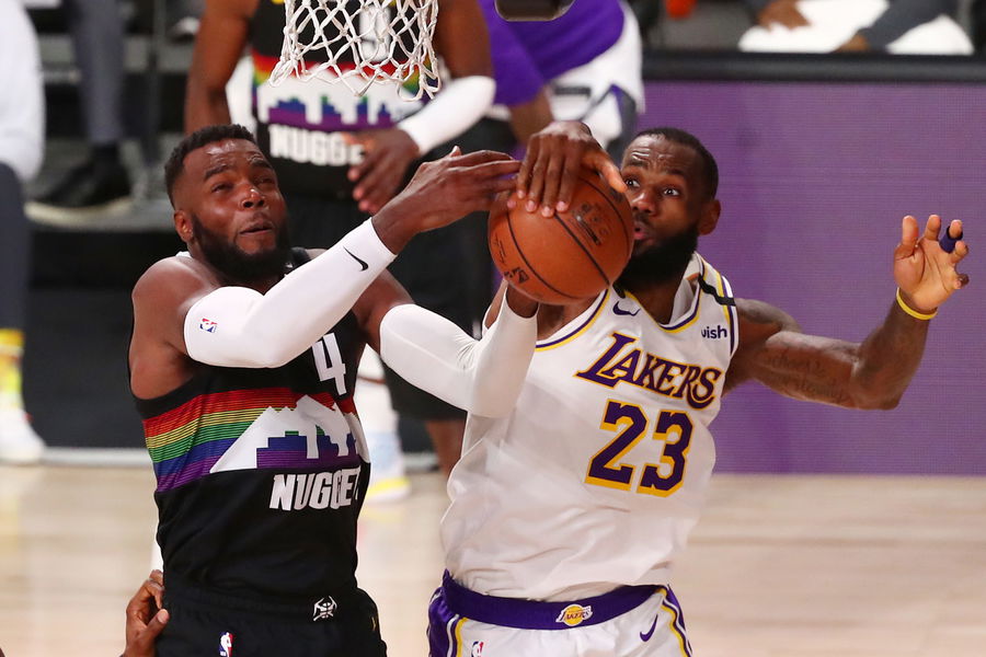 Denver Nuggets forward Paul Millsap and Los Angeles Lakers forward LeBron James battle for a rebound during the second half of game three of the Western Conference Finals of the 2020 NBA Playoffs. Mandatory Credit: Kim Klement-USA TODAY Sports