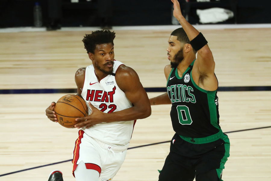 Sep 15, 2020; Lake Buena Vista, Florida, USA; Miami Heat forward Jimmy Butler (22) drives to the basket while Boston Celtics forward Jayson Tatum (0) defends during the first half in game one of the Eastern Conference Finals of the 2020 NBA Playoffs at ESPN Wide World of Sports Complex. Mandatory Credit: Kim Klement-USA TODAY Sports | Courtesy Reuters